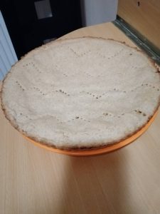 A tésztát válasszuk két felé, az egyiket egy szilikonos sütőforma aljába kézzel nyomogassuk el egyenletesen. Tegyük rá kanállal az almás tölteléket. A másik tésztát nyújtsuk ki olyan méretre amekkora a szilikon tepsink, nyújtófára tekerjük rá, majd a tepsire szépen visszafelé forgatva a nyújtófát tegyük rá a tésztát. Ha ez a rész nem megy, mert szakadna a tészta, egyszerűen nyújtsuk ki a tésztát, vagdosd fel csíkokra vagy szaggasd bármilyen formára mint a linzert és helyezd a töltelékre 😉